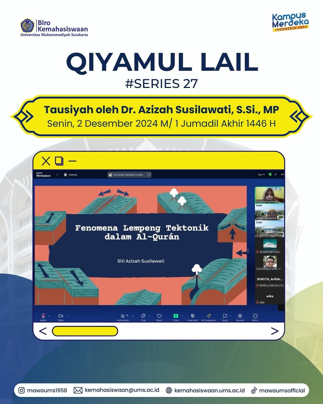 Biro Kemahasiswaan Bagian Kaderisasi, Dakwah, dan Layanan Sosial Mahasiswa Universitas Muhammadiyah Surakarta melaksanakan kegiatan Qiyamul Lail #series27. Tausyiah oleh Dr. Azizah Susilawati, S.Si., MP, selaku Wakil Dekan 3 Fakultas Keguruan dan Ilmu Pendidikan